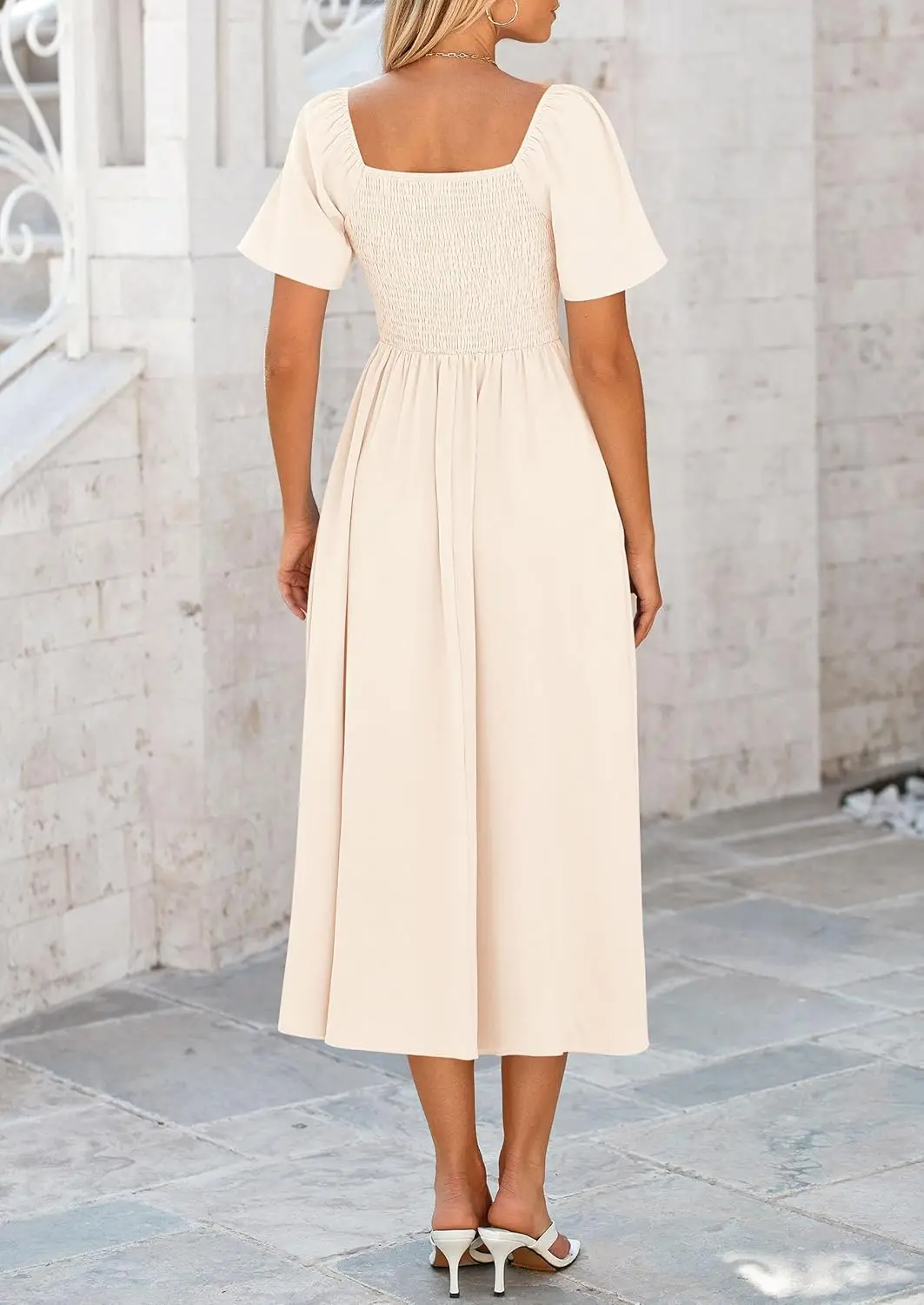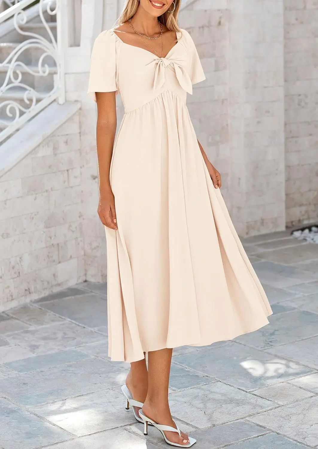 Women's Summer Casual V Neck Ruffle Midi Dress Short Sleeve Flowy Natural Waistline Solid Washable Loose ODM 100% Polyester